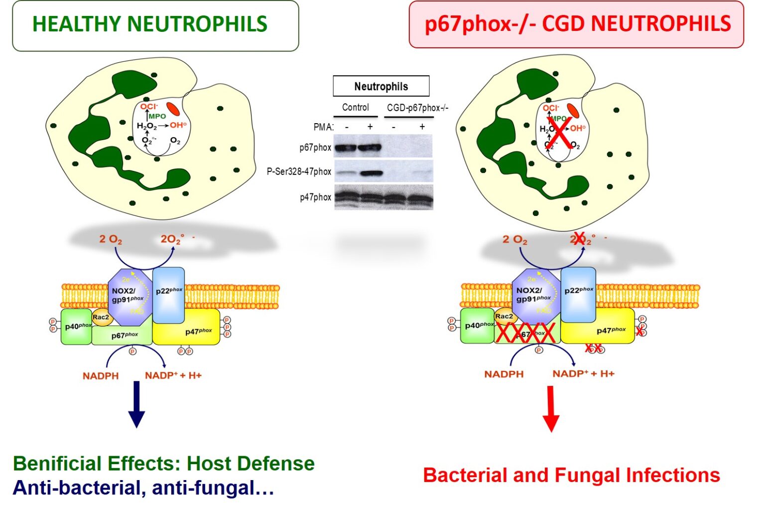 La production de ROS est nécessaire pour la défense de l’hôte, ceci est démontré dans la granulomateuse septique chronique (ou CGD), une maladie génétique qui se traduit par l’absence de production de ROS par les phagocytes, et où les patients présentent des infections plus létales que les individus en bonne santé. La CGD est une maladie rare retrouvée chez 1 individu sur 200 000 à 250 000. Elle est causée par une mutation génétique d’un des gènes codant pour les composants de la NADPH oxydase, la forme de CGD la plus fréquente étant causée par des mutations du gène gp91phox/CYBB (65 % des cas), suivies des mutations du gène p47phox/NCF1 (20 %), du gène p22phox/CYBA (moins de 5 %), du gène p67phox/NCF2 (moins de 5 %), et des gènes de la p40phox/NCF4 et de Rac2/NCF3 (les deux formes moins de 5 %). En plus de la défense de l’hôte, la production de ROS peut participer à des lésions tissulaires et à une inflammation excessive si elle n’est pas bien contrôlée. Ainsi, l’activation de la NADPH oxydase phagocytaire doit être étroitement régulée pour permettre la production des ROS au bon moment et au bon endroit. Un des mécanismes par lequel la NADPH oxydase est régulée est la phosphorylation de p47phox. Cependant, les voies qui régulent cette phosphorylation ne sont pas complètement connues.