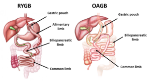 Figure: Remodeling of the gastrointestinal tract after 2 bariatric surgeries: Roux-en-Y Gastric Bypass (RYGB) and Gastric Bypass to Anastomosis (OAGB).