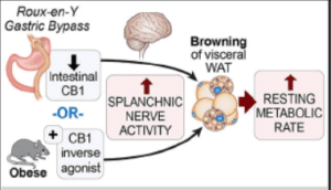 - l’administration d’un antagoniste du récepteur endocannabinoïde-1 (CB1), à des souris obèses mime les effets spécifiques de la chirurgie RYGB sur le métabolisme tandis que celle d’un agoniste CB1, en atténue les effets.