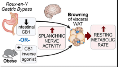 Dans cette étude, les chercheurs ont démontré, en utilisant une combinaison de calorimétrie directe et indirecte, une augmentation du métabolisme de base, en particulier sa composante anaérobie après RYGB, mais pas après SG. Cette augmentation était associée à une augmentation spécifique de l’activité nerveuse sympathique splanchnique et à un « brunissement » du tissu adipeux mésentérique.